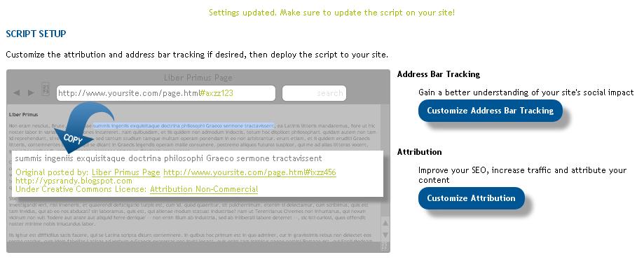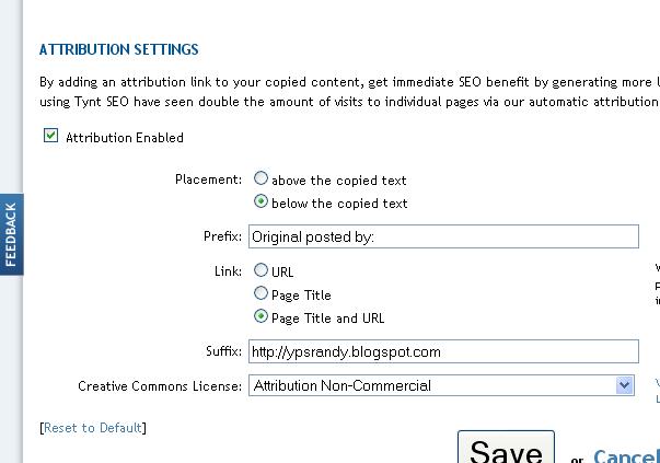 - customize attribution.Nah disini nih yang paling penting,Kamu bisa isikan seperti apa sih attribution yang kamu kehendaki,biar mbah google membaca,dari mana hasil copyan artikel mereka ,nah lo,ketahuan deh mengcopy paste milik orang tanpa izin.disitu nanti ada pilihan: